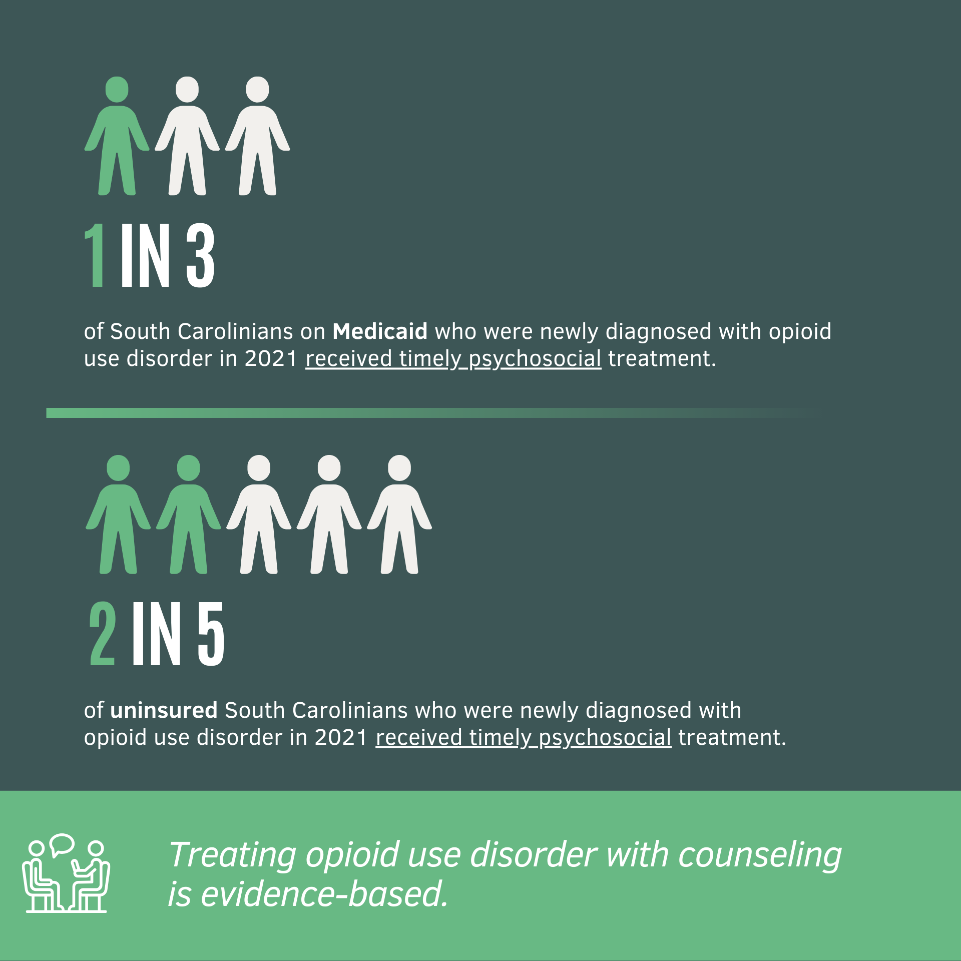 In summary, of South Carolina Medicaid enrollees aged 18-64 with a new opioid use disorder diagnosis in 2021, fewer than one in three people received psychosocial treatment in a timely manner. Of uninsured adults who received a new opioid use disorder diagnosis at a County Alcohol and Drug Authority or Opioid Treatment Program or an emergency department in 2021, fewer than two in five people received psychosocial treatment in a timely manner.