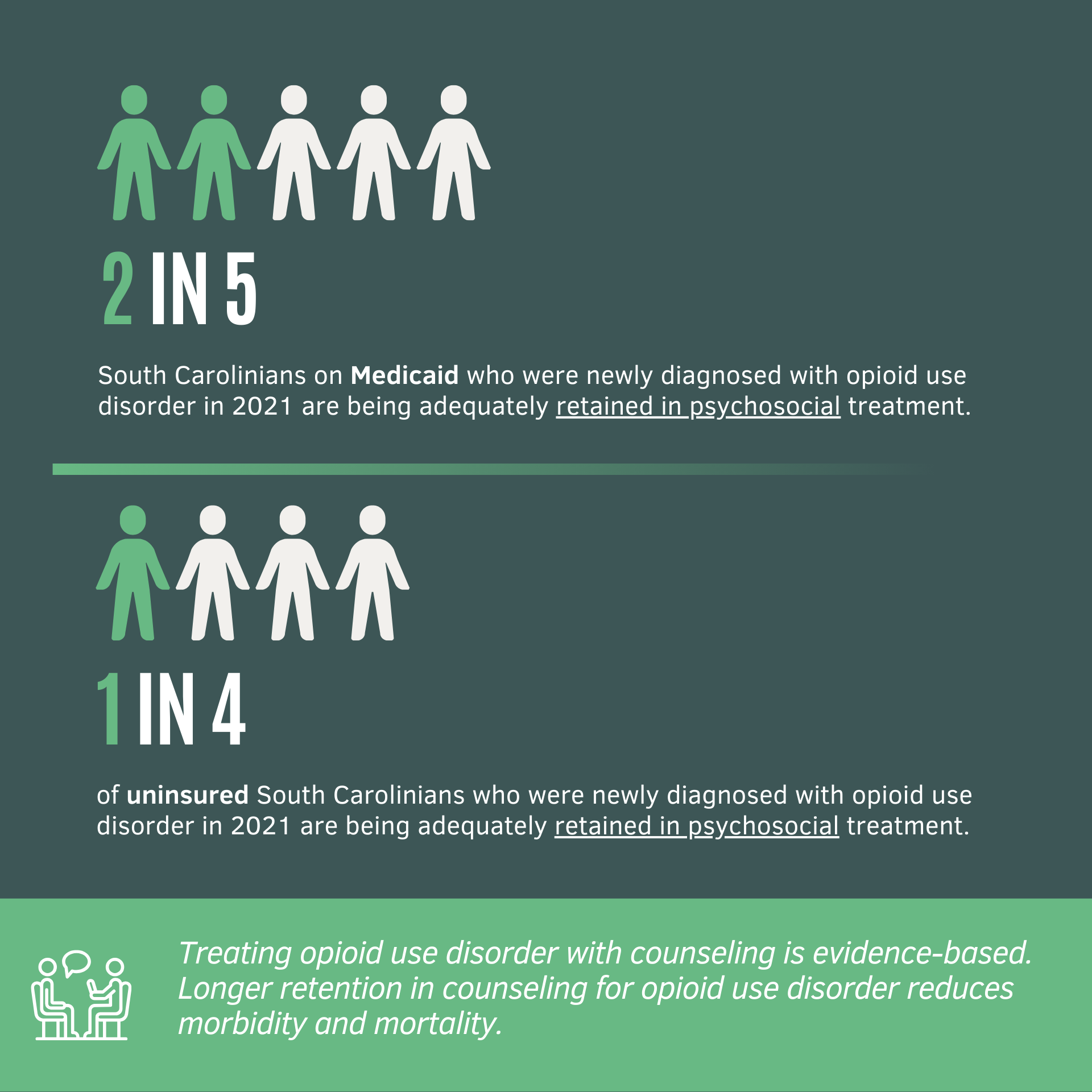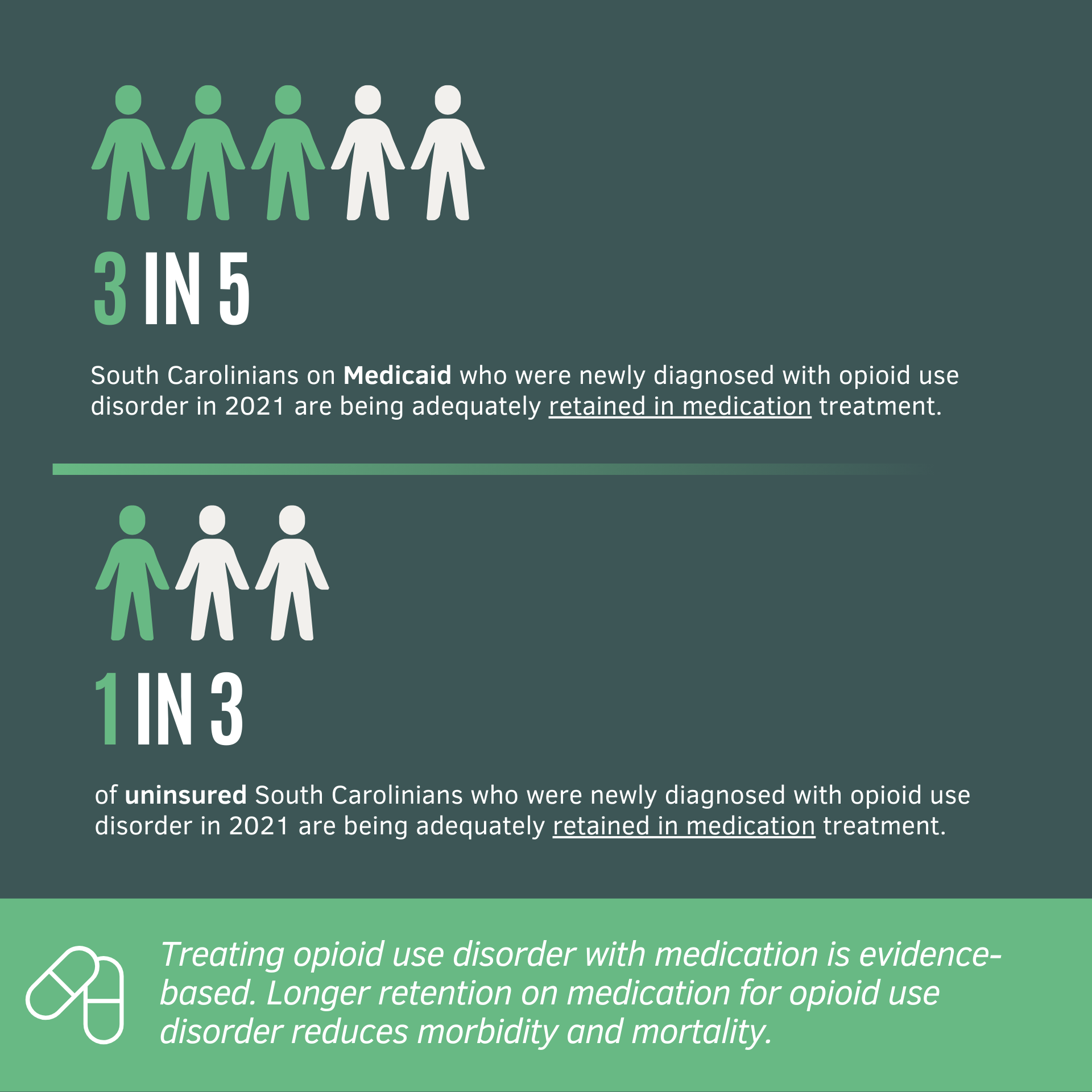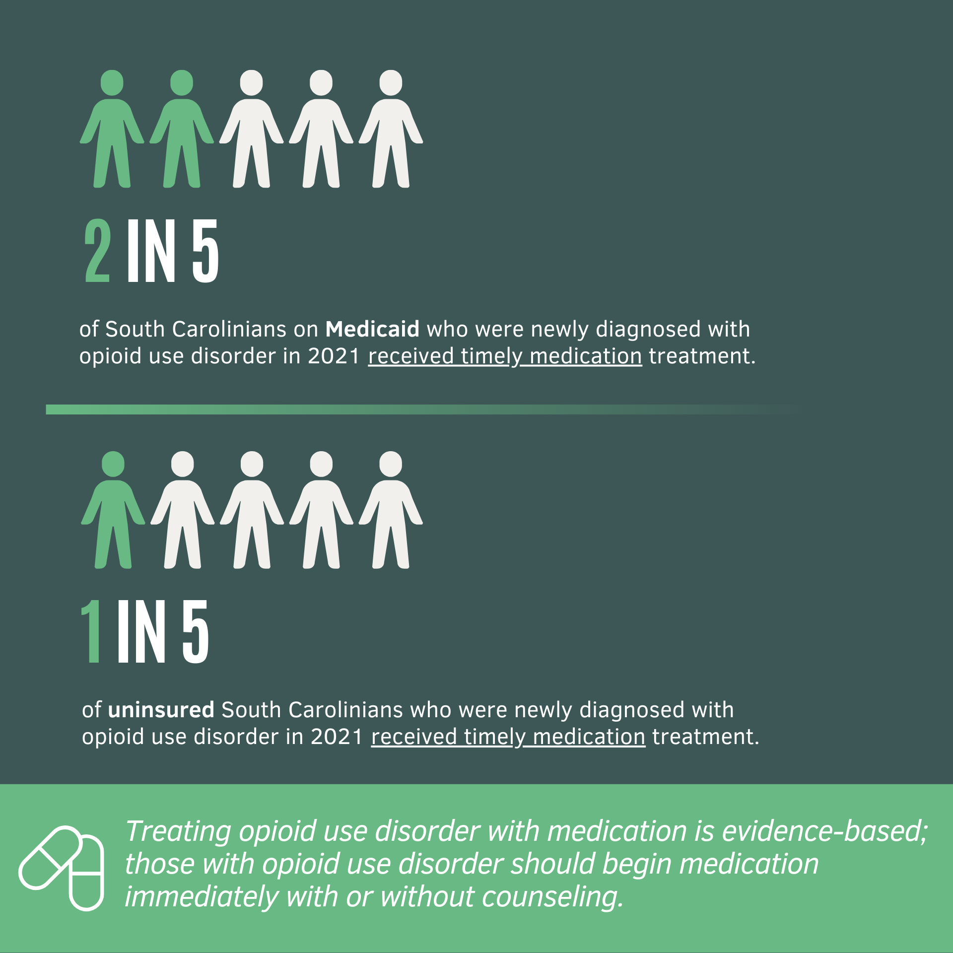In summary, of South Carolina Medicaid enrollees aged 18-64 with a new opioid use disorder diagnosis in 2021, three in five people were adequately retained in medication treatment. Of uninsured adults who received a new opioid use disorder diagnosis at a County Alcohol and Drug Authority or Opioid Treatment Program or an emergency department in 2021, two in five people were adequately retained in medication treatment.